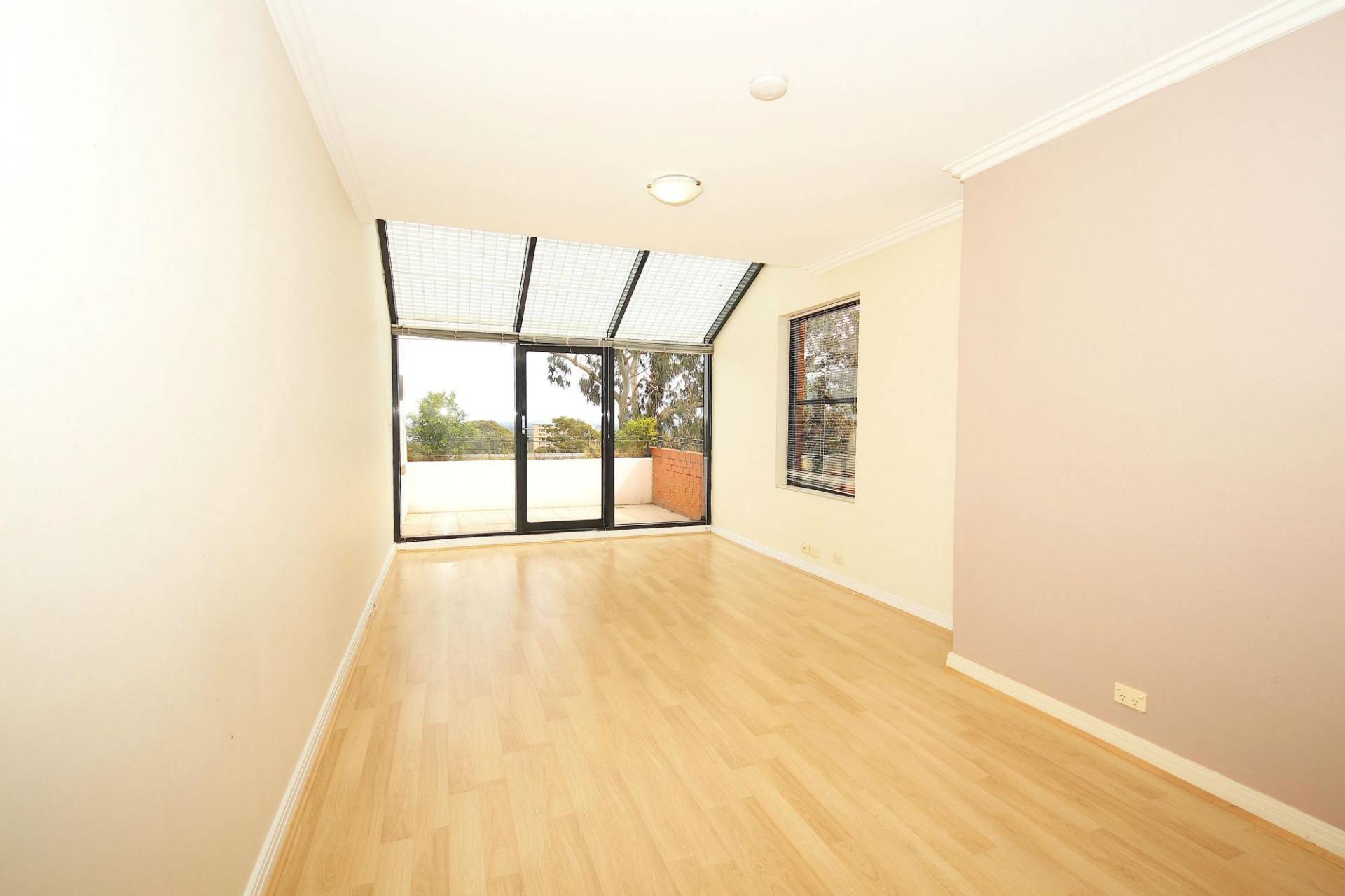 - The light filled open plan living area has high ceilings and leads to a good sized balcony through floor to ceiling glass doors.