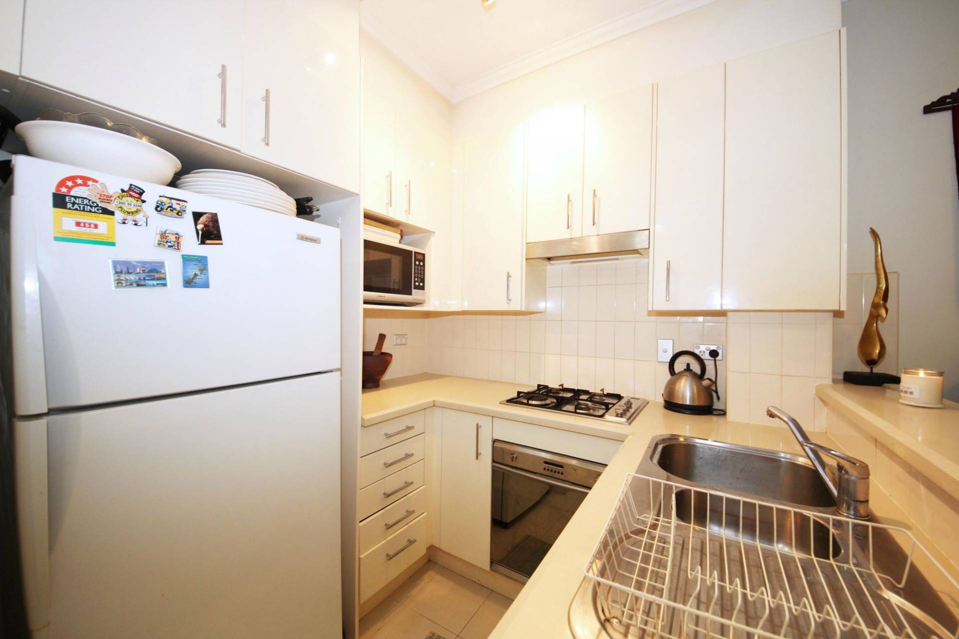 - Open plan kitchen with high quality stone bench tops and stainless steel appliances with gas cooking
