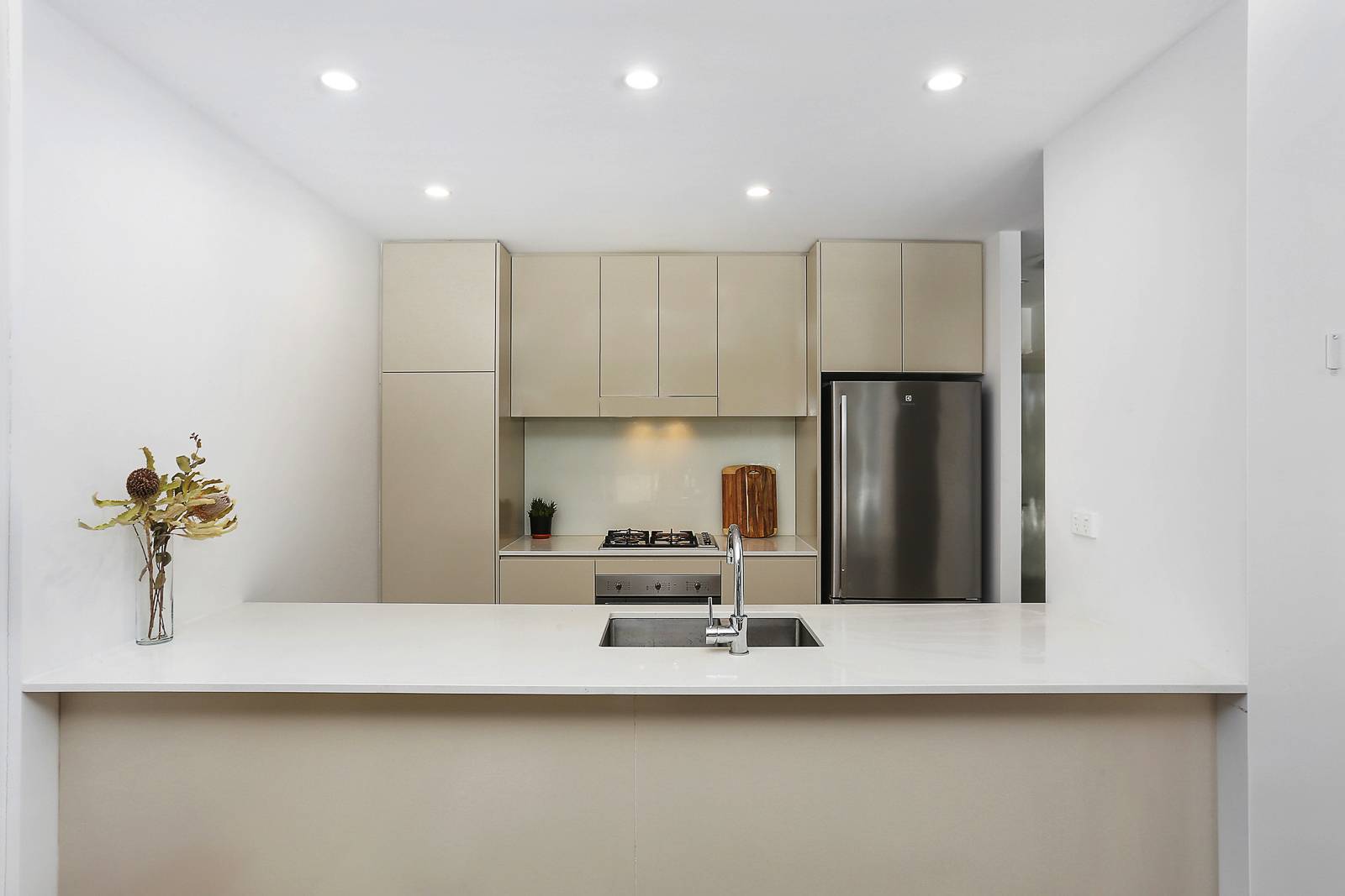 • Sleek galley style gas kitchen with Ceasarstone bench tops