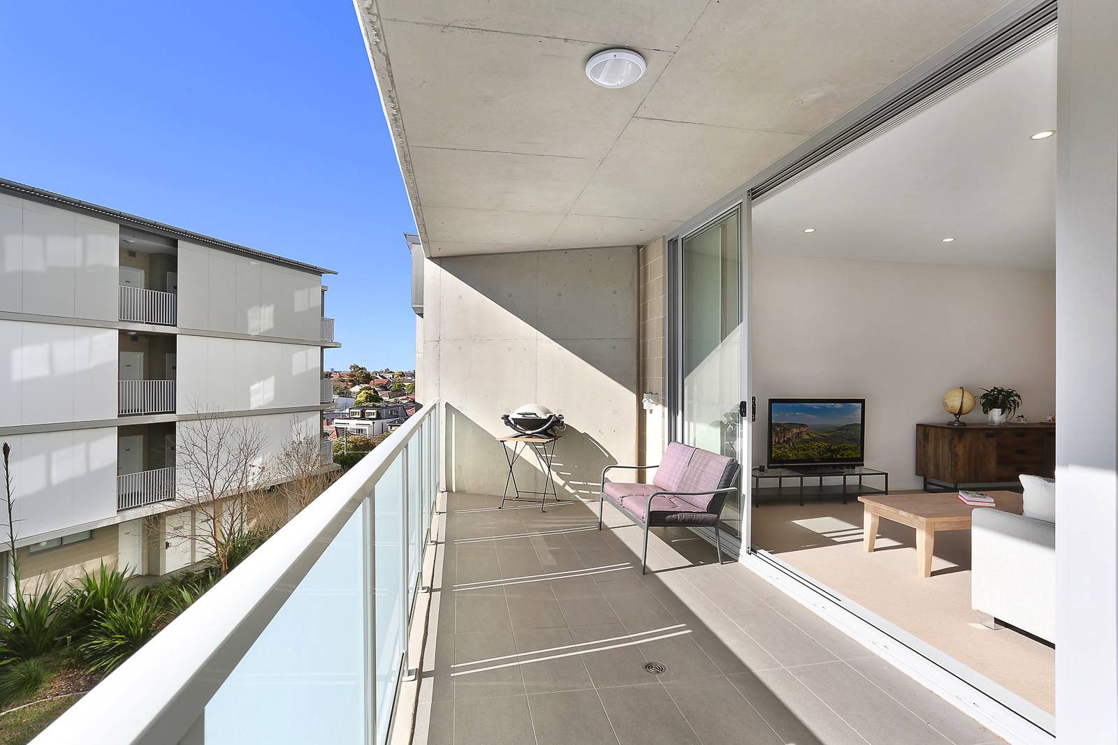 • Gorgeous sunny entertainer’s balcony flows from living area
